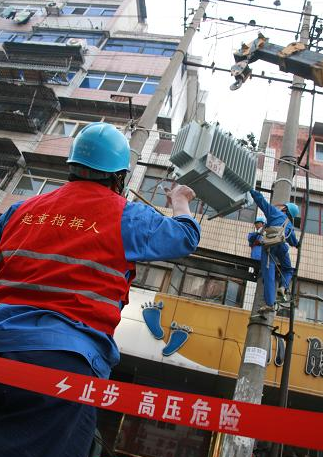 變壓器更換施工人員佩戴好絕緣手套、防墜器、安全帶、安全帽等工具,攀爬到高處拆除舊的變壓器,利用吊車、吊裝帶、鋁合金手扳葫蘆等工具將舊的變壓器吊運到地面;然后,再將新的變壓器起吊到高處進行安裝;安裝完畢后,通電進行測試,確保通電正常就可以投入使用。